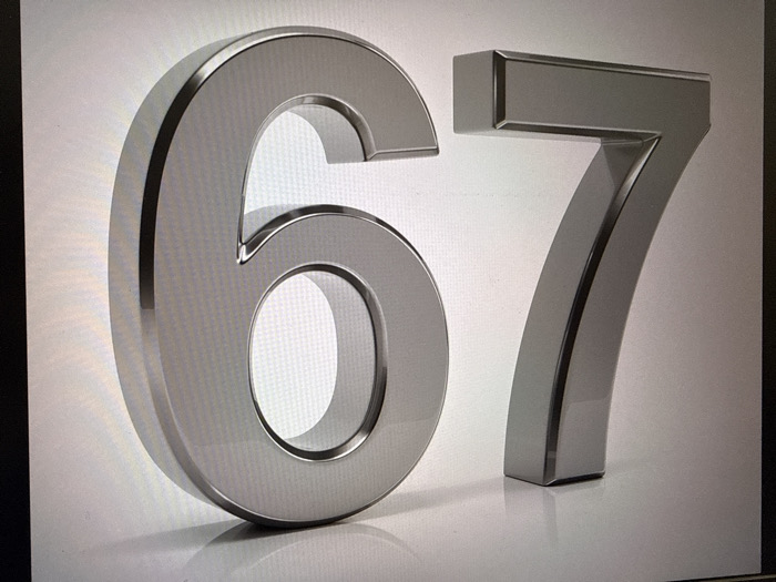 The scene displays two three-dimensional numerals, '6' and '7', crafted from a polished, reflective silver-colored material, positioned upright side-by-side to form '67'