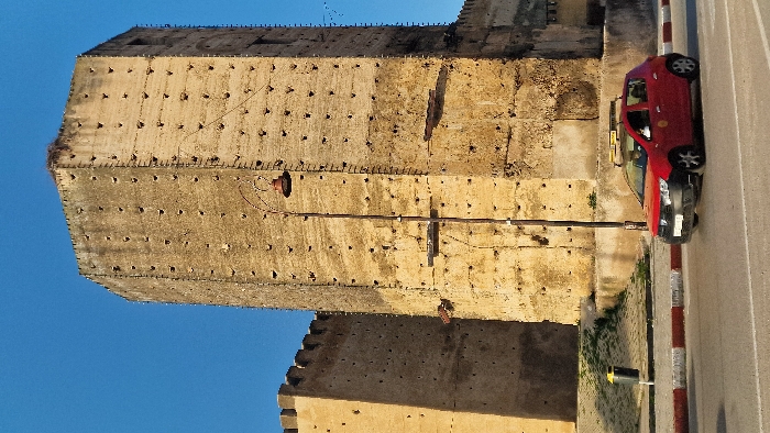 The image captures an outdoor urban scene in Mechouar Fes Jdid, Morocco, featuring historical fortifications and a contemporary vehicle