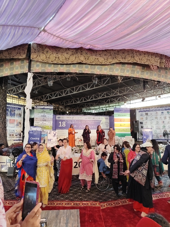 The image depicts an indoor event, specifically the 18th Asia Pacific Women in Policing Conference held in 2015 at the Serena Hotel, Islamabad, Pakistan. The upper frame is dominated by a temporary event canopy, composed of light purple and white draped fabric, beneath which is a decorative valance featuring a gold floral pattern over a teal and orange circular motif. A metal truss system is visible beneath the canopy, supporting stage lights. A raised stage occupies the background, adorned with banners. The central banner displays "18th Asia Pacific Women in Policing Conference - 2015" in English and Urdu. A vertical banner to the left reads "Closing Plenary," while a vertical banner on the right features "Welcome" in English and Urdu. White modern furniture, including sofas, is arranged on the stage's right side. Five women stand on the stage, appearing to perform or speak, dressed in various garments including a bright orange dress, dark patterned dresses, and a light brown ensemble. The foreground and mid-ground are populated by approximately 15-20 individuals, primarily women, engaged in dancing or celebratory movements on a red patterned carpet. Their expressions are largely positive and joyful. Notable individuals include: * Three women on the left, two prominently smiling; one wears a blue patterned salwar kameez and the other a yellow salwar kameez with a yellow dupatta. * A person's hands holding a black smartphone, actively recording the scene, are visible in the bottom-left corner. * A woman in a white striped shirt and a long red skirt is dancing. * A woman in a pink salwar kameez with a light pink dupatta is also dancing. * A man in a blue shirt is seated in a black manual wheelchair, smiling. * A woman in a black outfit with a distinctively patterned scarf/shawl is dancing. * Another woman in a dark traditional outfit, including a patterned top and cap, is also engaged in dancing. The participants' attire is a blend of traditional Pakistani clothing, such as salwar kameez and dupattas, and some Western-style garments. A black standing fan is partially visible on the far left. The scene is brightly lit.