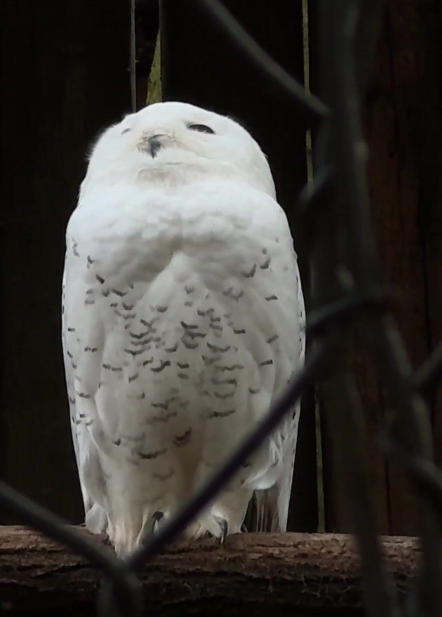 A stationary shot of a white snowy owl perched on a branch behind a chain-link fence. The owl has black markings on its chest and appears to have its eyes closed or partially closed. The background consists of a dark wooden structure. The lighting is dim.
