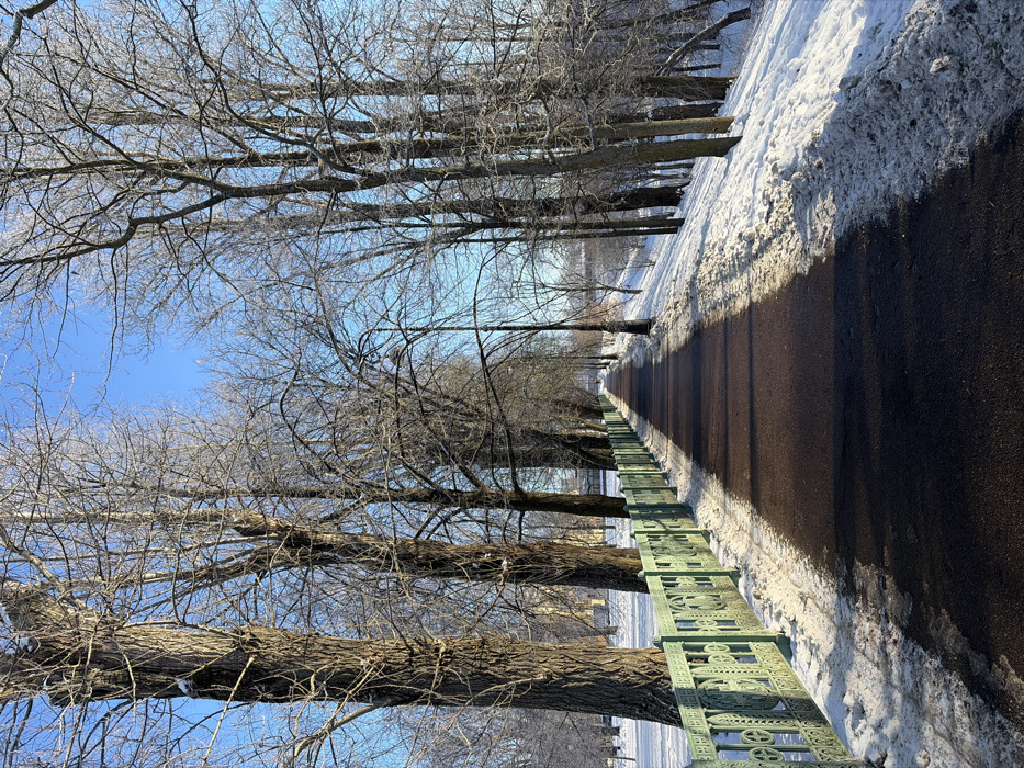 The image displays a straight, dark-paved pedestrian path in a winter park setting within Kronstadt, Russia, illuminated under a clear blue sky. The path, clear of snow, extends centrally from the foreground towards a distant vanishing point, marked by alternating sections of bright sunlight and shadow. On the left side of the path, a uniform row of mature, bare deciduous trees with thick trunks stands, paralleled by an ornate, dark green metal fence featuring repetitive geometric and circular motifs. Snow covers the ground between the path and the fence, accumulating in drifts at the fence's base and extending into the park area beyond. On the right side, a snow-covered embankment slopes gently upwards from the path, densely populated with numerous bare deciduous trees. Many of these trees exhibit visible hoarfrost on their branches. A singular black streetlamp, with a visible light fixture, is positioned approximately midway along the path on this side. In the background, beyond the trees on the right, indistinct urban structures are partially visible. No individuals, animals, or active interactions are present within the frame. The scene conveys a static, clear, and cold winter day.