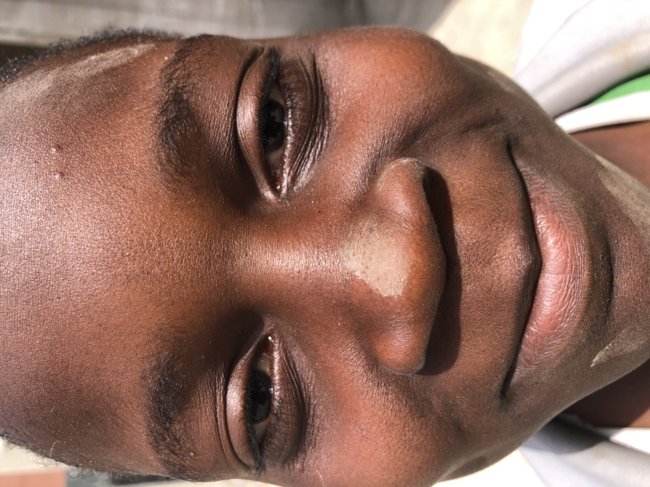 The image presents a close-up, head-on portrait of a young individual with a dark complexion, captured near Muhammadu Dikko Stadium in Nigeria. The subject's eyes are open and directed towards the viewer, with dark irises reflecting light. A distinct, irregular patch of lighter-toned material, consistent with dust or dry skin, is prominent on the bridge of the nose. Small, raised lesions are visible on the forehead. The mouth is closed, forming a subtle upward curve. Direct, strong sunlight illuminates the face, creating highlights on the forehead, cheeks, and nose, while casting soft shadows under the nose and chin. Portions of a white garment with a green collar or trim are visible at the lower edges of the frame. The background is uniformly light-colored and out of focus, indicating an outdoor setting.