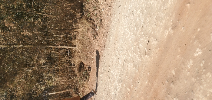 A pathway intersects a forest's edge. The road, composed of mixed dirt and concrete, is textured with scattered light-colored marks. The forest, comprised of bare trees and sparse foliage, is dense and textured. A long shadow stretches onto the pathway, originating from a person near the bottom edge. Vegetation and dry foliage separate the road and the forest.