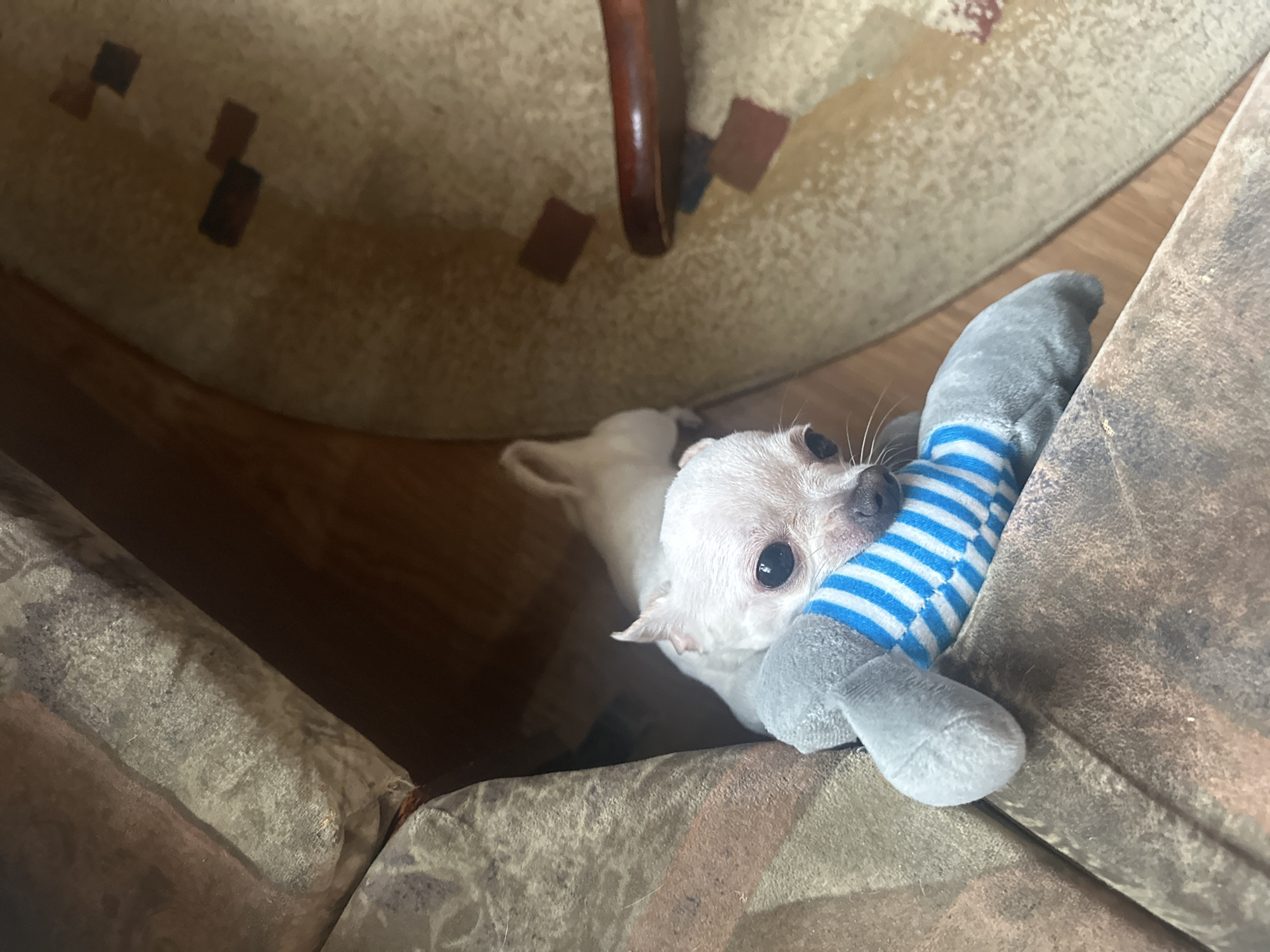 A small, white Chihuahua dog is positioned between a patterned rug and a brown chair. The dog has a gray and blue striped plush toy lodged against its face. The exact location in Sliven, Bulgaria cannot be determined from the visual information.
