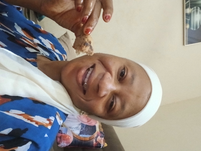 An adult female is depicted in an indoor setting in Dadi Riba, Nigeria. She wears a white head covering and a blue shirt with abstract white, orange, and brown patterns. Her left hand, with red-painted fingernails, holds a piece of light-brown, crumbly food near her open mouth. She is smiling broadly, revealing teeth, one of which appears to have a metal cap, and she has a piercing on her left nostril. The background consists of a plain, light-colored wall with a framed picture in the upper left corner and a patterned cushion visible on a dark sofa to her right.