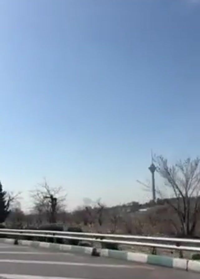 view from a moving vehicle driving along a road with a guardrail. The sky is blue with some clouds. On the other side of the road and guardrail, there is a park-like area with trees and some greenery. In the distance, a tall tower-like structure is visible. The trees appear to be mostly bare, suggesting it might be winter or early spring. The road is marked with painted lines.