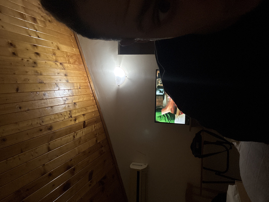 The scene depicts an interior room in Prolaz, Bulgaria, characterized by dim ambient lighting. The ceiling is composed of horizontal, varnished light-brown wooden planks with visible grain. The walls are light-colored, with an angled section where they meet the ceiling. A semicircular, wall-mounted light fixture with a translucent cover is active, emitting bright light upwards and downwards onto the wall, reflecting off the ceiling. A white split-system air conditioning unit is mounted high on the left wall. In the mid-ground, a flat-screen television is visible, resting on a stand or small table. The television screen displays an individual wearing a bright green shirt, with their hands and forearms actively engaged in an unseen task over a surface. To the left of the television, a dark bag with a strap rests on a surface. Part of a light-colored bed with white bedding is visible in the lower left portion of the image. A dark-framed table or stand is situated in the mid-ground. The foreground is occupied by the upper right portion of a person, primarily in shadow. Their right ear, the right side of their face, and their right shoulder are discernible. The person appears to have dark, short hair and is wearing a dark-colored shirt. Their right eye is visible, directed towards the television.