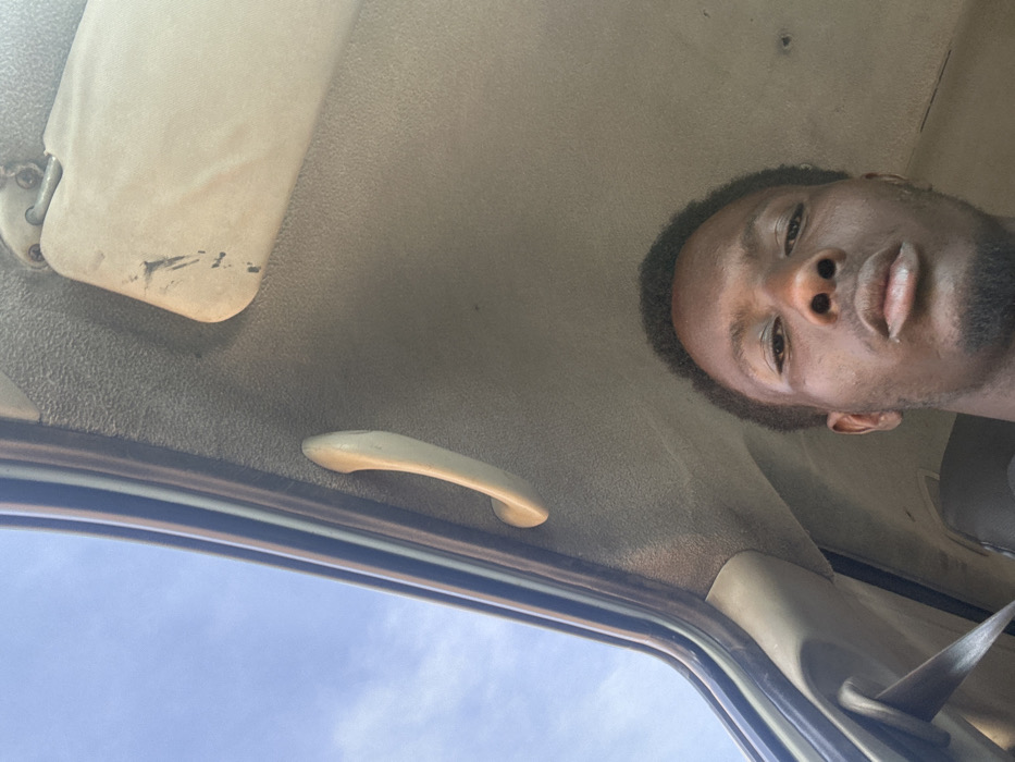 The image depicts a low-angle perspective of a young adult male positioned inside a vehicle, presented as being located in Aboro, Nigeria. The male subject, appearing to be of African descent, occupies the lower half of the frame, looking directly at the camera with a neutral expression. He has short, dark, curly hair and a short, neatly trimmed beard. Above the subject, the vehicle's interior ceiling is visible, upholstered in a light gray, textured material that shows some discoloration and minor wear. A beige-colored grab handle is affixed to the ceiling panel, positioned to the upper left of the subject. Further to the right in the upper frame, a beige sun visor is present, displaying dark smudges and signs of wear along its lower edge. On the far left, a portion of the vehicle's dark-colored window frame or door pillar is visible, outlining an opening through which a clear, light blue sky is discernible, suggesting an outdoor setting or an open window. A dark-colored seatbelt strap is also partially visible in the lower left corner, near the subject's left shoulder. The overall scene suggests a selfie taken from the driver or passenger seat of an older model vehicle.
