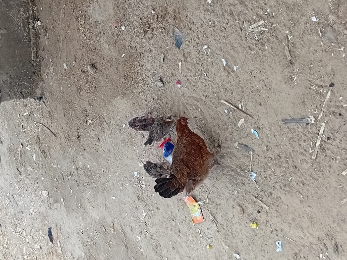 - "The scene is set on a light brown dirt ground in Ayama, Nigeria, which is sparsely covered with small debris including plastic wrappers (visible in orange, blue, and yellow), wood fragments, and general refuse" by FM-HNqRk1, licensed under CC BY 4.0