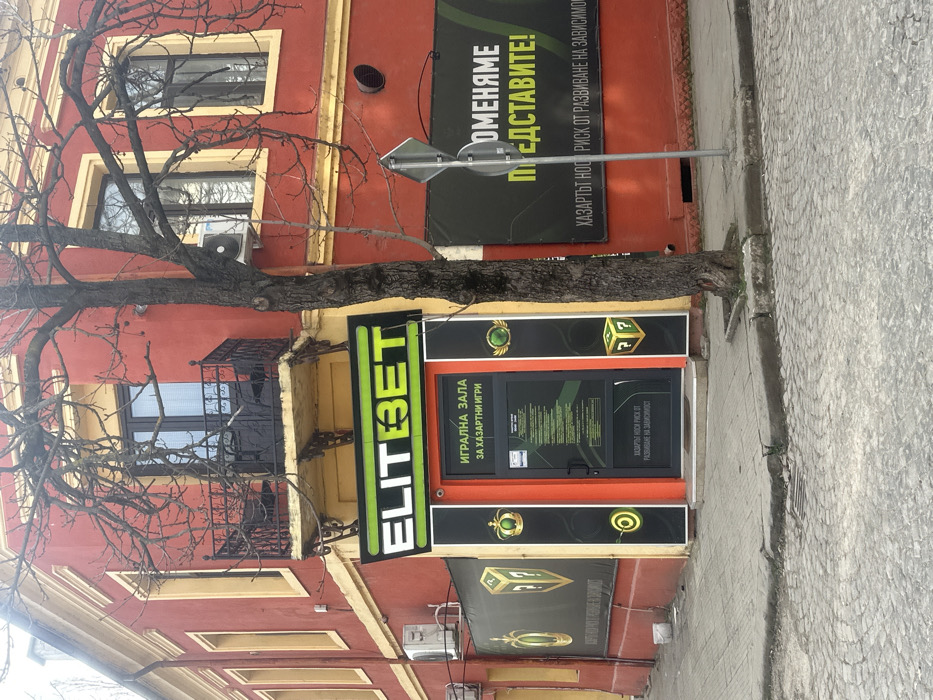 A forensic examination of the image reveals a street scene in Cherven Bryag, Bulgaria, depicting the corner of a two-story building. The building is painted red with yellow architectural trim, featuring several windows and a corner balcony on the upper level. The balcony is equipped with a black ornate metal railing and contains two dark chairs and a small table. On the ground floor, a gambling establishment named "ELITBET" is prominently featured. The entrance consists of a black-framed glass door, flanked by vertical orange/yellow trim panels. Above the door, a backlit sign displays "ELITBET" in white and green lettering. Directly below this, a sign in Bulgarian reads "ИГРАЛНА ЗАЛА ЗА ХАЗАРТНИ ИГРИ" (Gambling Hall for Gambling Games). The door itself has information posters adhered to its glass. Flanking the entrance are black panels with green and gold graphics, including a crown, question mark boxes, and a target-like symbol. To the left of the entrance, an external air conditioning unit is mounted on the red wall. To the right of the ELITBET entrance, a large black banner with white and green Bulgarian text reads "ПРОМЕНЯМЕ ПРЕДСТАВИТЕ!" (We Change Perceptions!) and "ХАЗАРТЪТ НОСИ РИСК ОТ РАЗВИВАНЕ НА ЗАВИСИМОСТ" (Gambling carries a risk of developing addiction). A small, round, red vent is visible on the red wall above this banner. Another air conditioning unit is mounted on the wall to the right of the tree on the first floor. In the foreground, a cobblestone street is visible, transitioning to a grey concrete sidewalk with a curb. A bare deciduous tree with dark bark and branches stands centered in front of the building, obscuring parts of the upper and lower facades. To the right of the tree, a grey signpost with a circular sign, partially obscured, is present. No individuals are present in the depicted scene. The sky is overcast, and the scene is illuminated by ambient daylight.