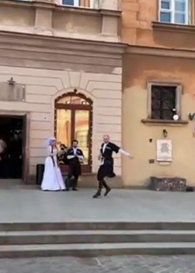 On a sunny day, a group of three individuals is on a stone stage in front of a building. The building is a light-colored two-story structure, with a set of windows and doors. The scene is outdoors, with sunlight highlighting the details of the building's facade. A man in black traditional attire dances on the platform, his movements sharp and precise. A woman, also in traditional clothing that includes a white dress and headdress, stands to the side, watching him. Another man stands clapping near her. A speaker sits to the side of the group, and behind them is a door.