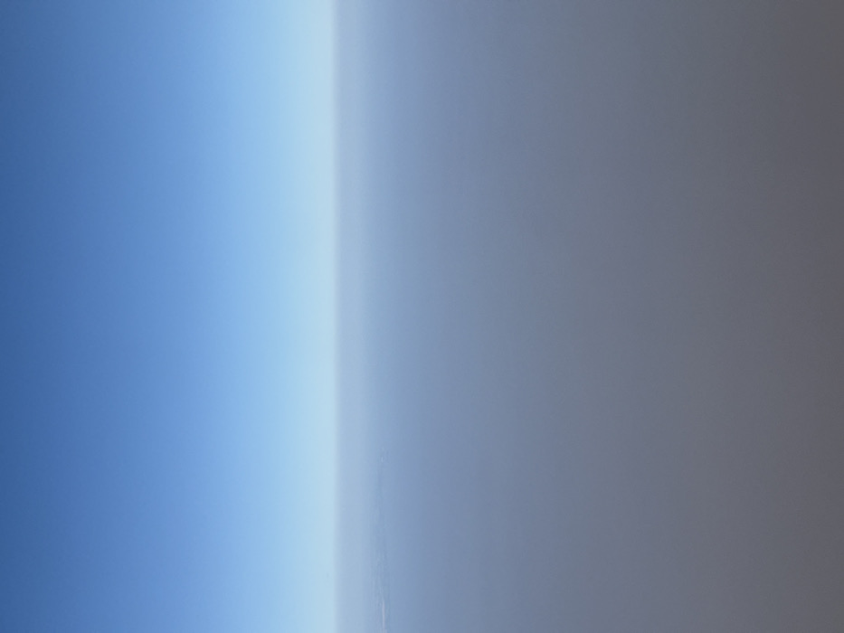 The image displays a gradient from blue on the left to a muted grey-brown on the right. A bright, almost white vertical band separates the two color fields. The transition between the blue and white areas is gradual, while the shift from white to the grey-brown is more abrupt. Minimal texture or detail is present, creating a smooth, abstract composition. A slight vertical imperfection is visible in the center.