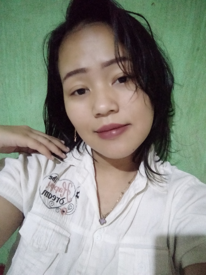 A young woman poses in a selfie against a green wall. She has dark hair and brown eyes, with a neutral expression. She wears a white, button-down shirt with an embroidered design on the upper left side. A delicate necklace with a light purple pendant adorns her neck. Her makeup includes lipstick with a mauve tint. Her hand rests on her collarbone, adding a casual touch to the image.