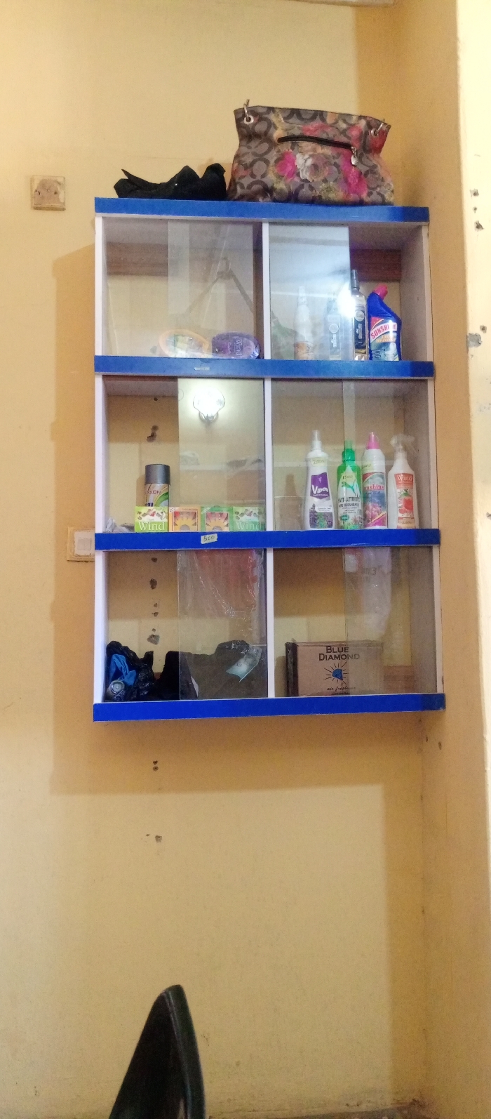 The image presents an indoor scene with light beige-colored walls. A wall-mounted cabinet, featuring a blue frame and white internal dividers, is centrally positioned. This cabinet comprises three shelves, each divided into two compartments with clear sliding doors. On the top surface of the cabinet, a grey handbag with a floral pattern and a dark, unidentifiable object are visible. Within the cabinet's compartments, from top to bottom and left to right: - The top-left compartment contains several packaged items, including one labeled "Wind." - The top-right compartment holds a clear tall bottle and a blue plastic bottle branded "SUNSHINE." - The middle-left compartment contains a silver spray can (faintly branded "EXXON") and three small rectangular boxes labeled "Wind." A handwritten "500" mark is present below this compartment. - The middle-right compartment contains four plastic bottles: a white bottle (labeled "Vapex"), a green bottle (labeled "Puma Fresh"), a pink and white bottle (labeled "Sunshine"), and a white spray bottle (labeled "Wind"). - The bottom-left compartment contains dark, bundled materials, possibly fabric or bags, and a small metallic can. - The bottom-right compartment contains a cardboard box labeled "BLUE DIAMOND air freshener." Two light-colored electrical outlets or switches are visible on the left wall. The lower-left foreground shows the top portion of a dark-colored chair. The walls exhibit minor scuff marks and imperfections. No individuals are present, and no actions or interactions are depicted.