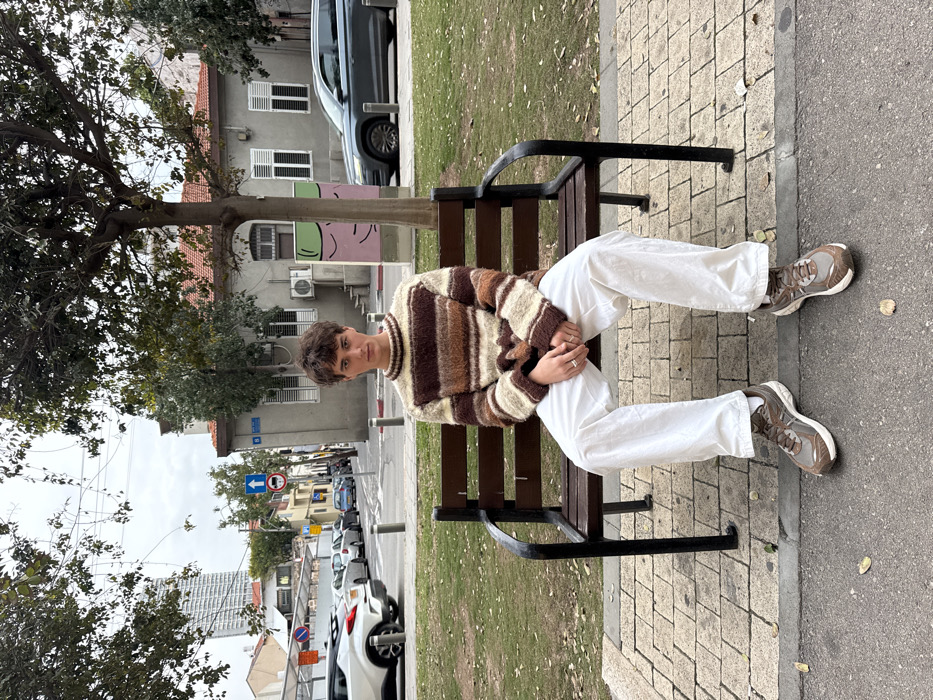 A young person sits on a park bench next to a sidewalk and road lined with parked cars and buildings. The person wears white pants, brown sneakers, and a striped brown sweater. They are looking directly at the camera. A tree stands next to the bench, and buildings and a grey car are in the background. The ground is paved with tiles and asphalt.