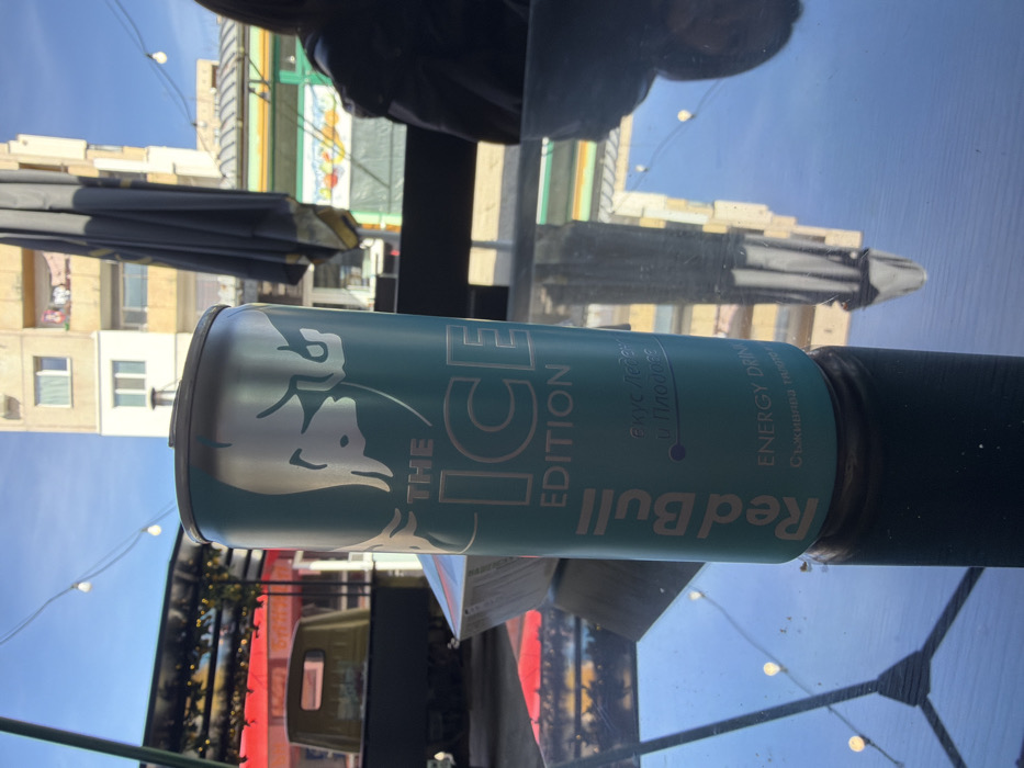 - "A teal-colored Red Bull "THE ICE EDITION" energy drink can, prominently displaying its silver logo and Bulgarian text for "flavor ICE AND FRUIT" and "revitalizes body and mind," stands upright on a highly reflective dark glass table" by FM-ESoMI3, licensed under CC BY 4.0