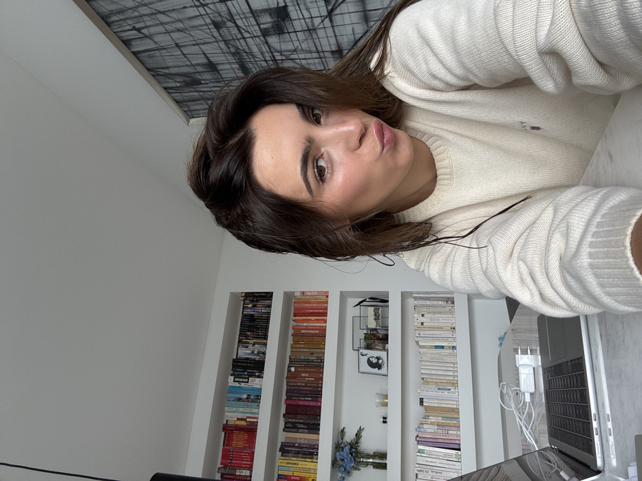 A female individual is captured in a close-up, self-portrait style image within an indoor setting. She has dark brown hair, which appears to be damp or styled with a wet look, with strands falling across her shoulders. Her face is directed towards the camera, exhibiting a puckered lip expression. She is wearing a cream-colored knit sweater with a visible "GANT" emblem on the left chest. The background reveals a white wall featuring three recessed bookshelves populated with numerous books. On the lowest shelf, to the left, a clear vase holds blue flowers, accompanied by a small white candle. Several framed images, including a black-and-white portrait of a woman and a landscape, are also displayed on this shelf. To the far right, a large piece of abstract wall art with black and white intersecting lines is visible. The ceiling is white. In the lower left foreground, a silver-colored laptop is open on a light-colored, possibly marble, surface. A white charging adapter and cable are connected to the laptop and rest on the surface. The setting is an interior space, indicative of a home or private office environment. The image itself contains no visual markers to confirm the location in Loures, Portugal.