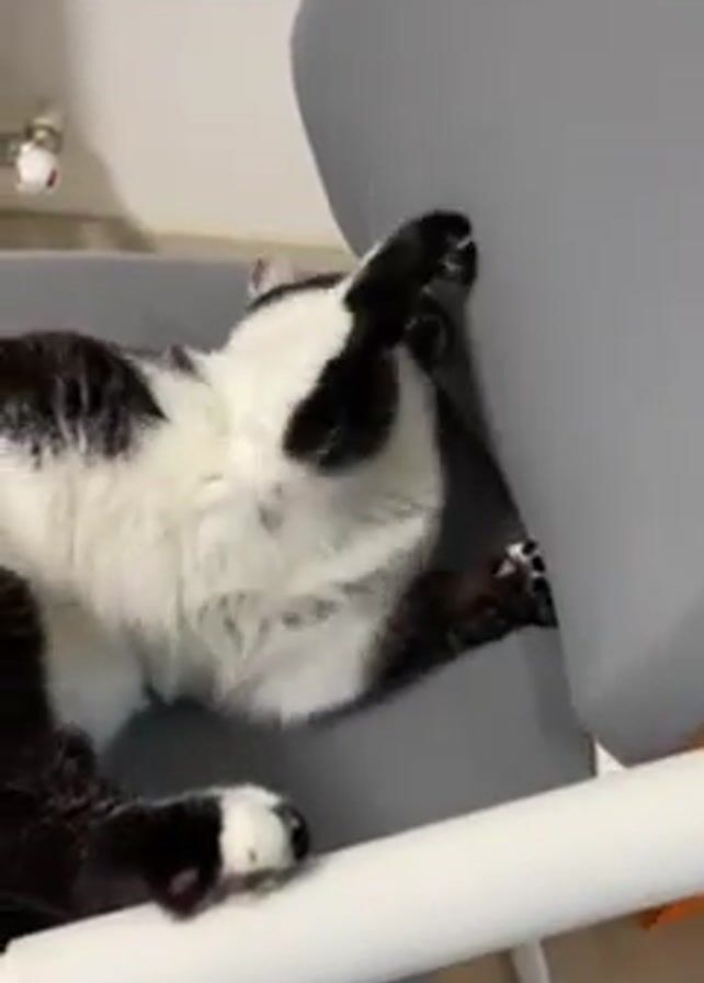 A black and white cat is laying on a gray chair, resting its head against the back of the chair. It then moves its front paws up and scratches the chair’s back a few times. The cat looks towards the camera as a human hand pets it briefly. The chair has a white frame. The background is blurry but appears to be inside a home.