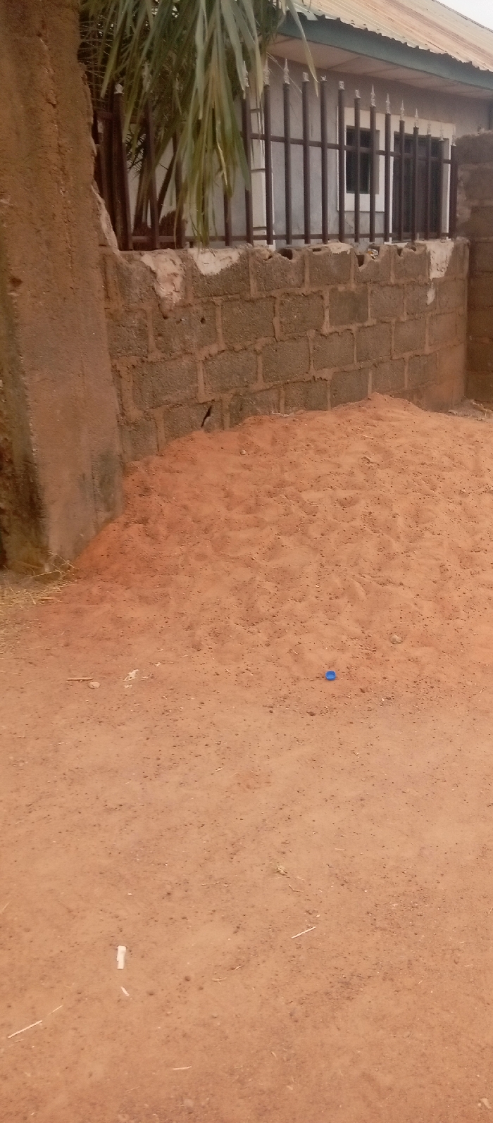 A partially built brick wall fronts a house with barred windows. A palm tree is visible behind the wall. A pile of reddish-brown sand sits against the wall. The foreground shows dirt, with a few small pieces of debris scattered about, including a blue bottle cap. The overall scene appears to be a construction site or an area undergoing some kind of renovation.