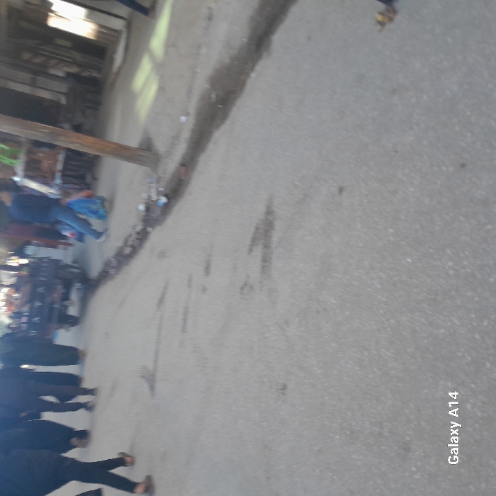 The image displays a blurry street scene in Deir el-Balah, Palestinian Territory, captured from a low perspective. The foreground consists of a gray asphalt road surface with indistinct dark smudges. A narrow, dark trench filled with dirt and scattered debris runs diagonally from the mid-right towards the upper-center of the image, separating the road from what appears to be a curb or sidewalk on the right. Multiple individuals are present. In the immediate left foreground, the lower legs and feet of a person wearing dark trousers and light-colored shoes are visible, moving leftward. Further back on the left, several other figures, predominantly dressed in dark clothing, are observed walking. In the mid-right, a male individual wearing a blue long-sleeved shirt and blue jeans is walking leftward, carrying a blue bag in his right hand. A stout wooden pole rises vertically from the ground on the far right, partially obscuring the background. Mid-ground to background elements include a small, dark-colored three-wheeled utility vehicle or motor-rickshaw, possibly marked "HAYAJI" or similar text, positioned near the center-left and carrying items. Behind the pedestrians and vehicle, blurred structures suggestive of storefronts or market stalls are visible, with indistinct merchandise, including a prominent green object. The scene is illuminated by natural daylight. A "Galaxy A14" watermark is visible in the lower-left corner of the image.