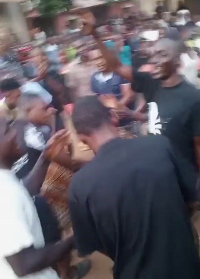 A crowd of people of various ages and skin tones are gathered outside, seemingly dancing to music. A person is playing a drum. Many people are wearing casual clothes, including t-shirts and shorts. The crowd appears to be moving in a somewhat chaotic fashion. Buildings and trees can be seen in the background, suggesting a residential or village setting.