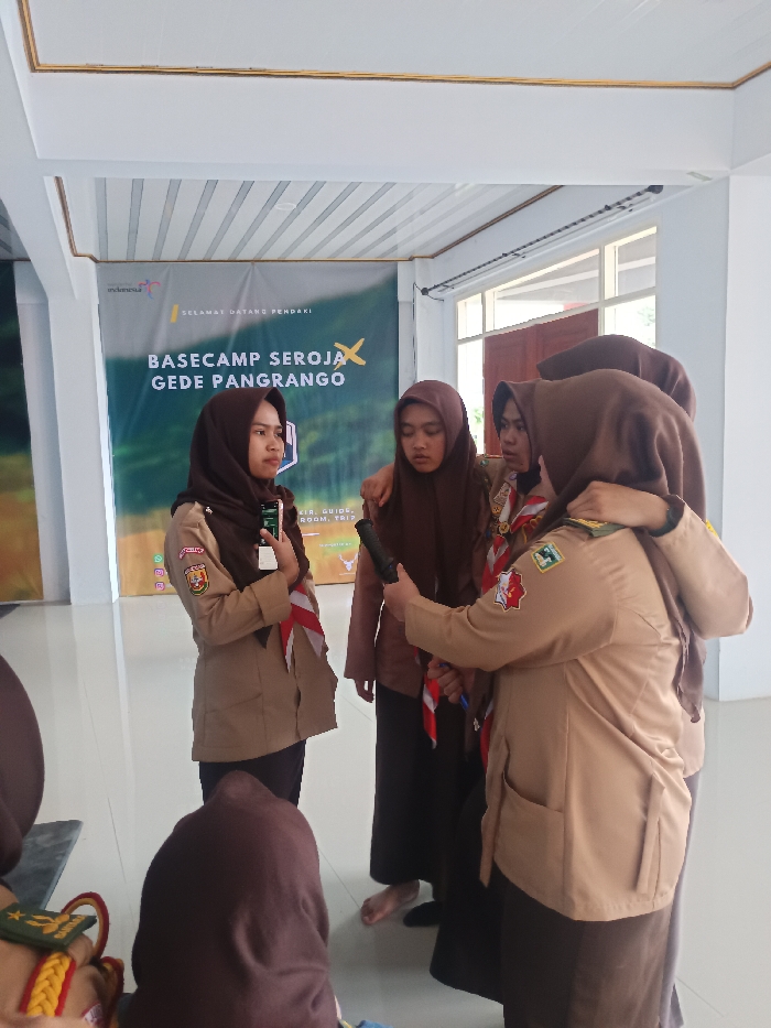 The scene is indoors, within a facility identified by a large banner as "BASECAMP SEROJA GEDEH PANGRANGO," likely located in Gunung Putri, Indonesia. The banner, featuring "SELAMAT DATANG PENDAKI" (Welcome Climbers) and "Wonderful Indonesia" branding, hangs against a white wall. The room has white tiled flooring and a white paneled ceiling with gold trim. Five young females are present, at least four of whom wear khaki scout-style uniforms with red and white neckerchiefs and dark brown hijabs. One individual in the foreground is partially visible and out of focus. In the mid-ground, a central group of four females is engaged in an interaction. A female on the left, wearing a khaki uniform and dark brown hijab, holds a black smartphone vertically in her left hand, displaying a green interface, seemingly presenting information. Immediately to her right, another female in a plain brown hijab and dark attire stands barefoot, appearing to listen. Adjacent to her, a uniformed female with a dark brown hijab and a red and white neckerchief has her left arm around the shoulders of the barefoot individual, offering support or comfort. This uniformed female holds a black cylindrical object, resembling a microphone, in her right hand, directed towards the center of the group. A fourth uniformed female with a brown hijab is partially visible on the far right, with her left arm draped over the shoulder of the central uniformed female. The group appears to be engaged in a discussion or interview.