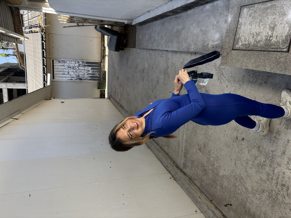 A woman in a blue jumpsuit and white sneakers stands in an outdoor alley. She smiles at the camera, holding a black strap, water bottle, and phone. The alley is enclosed by tall, white, weathered buildings on either side. The ground is concrete. A black suitcase and what appears to be a ladder are against one of the buildings. A square concrete lid is embedded in the ground on the opposite side.