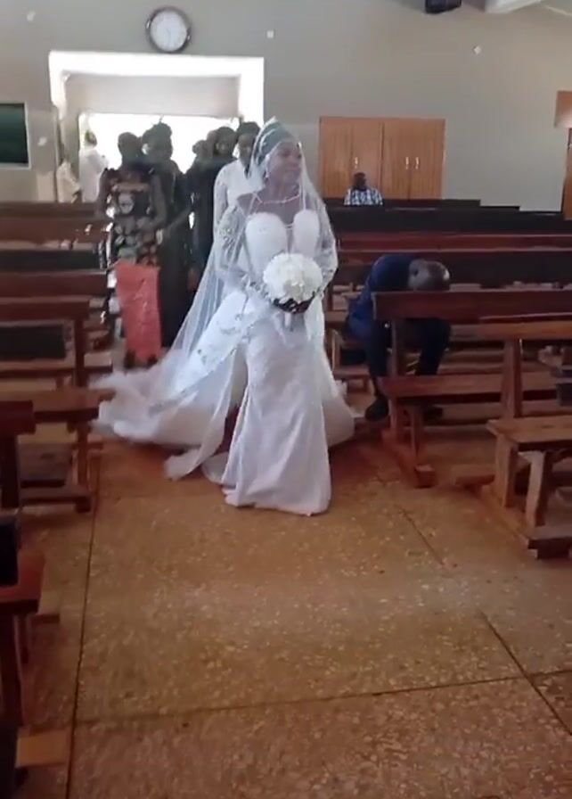 A bride wearing a white wedding dress, a veil, and holding a bouquet is walking down the aisle of a church. There are a few people walking behind her, and some people sitting in the pews. Someone is bending down near the pews. The floor is patterned and the walls are white. There is a clock on the wall.