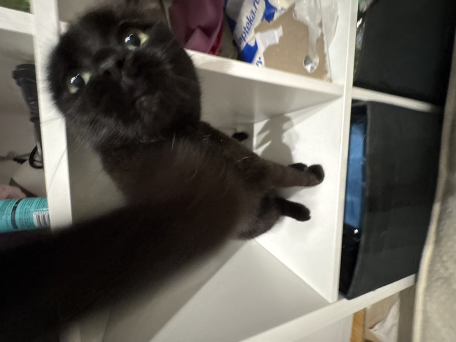 A black cat with large, expressive eyes peers out from a white cubby shelf. Its body stretches down and to the left, with a visible paw resting on the edge of the shelf. The cat's fur is dark, making its bright eyes stand out. A shelf filled with various items is visible behind the cat, adding to the cluttered and cozy indoor scene.