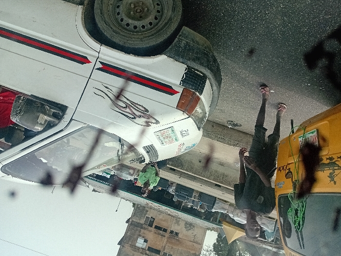 The image captures a street scene in Satellite Town, Nigeria, under an overcast sky