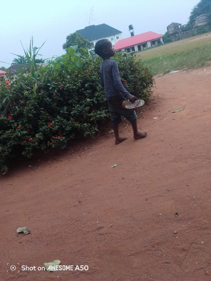 - "A young boy stands barefoot on a reddish-brown dirt path, holding sandals in his hand" by FM-QHhYG3, licensed under CC BY 4.0