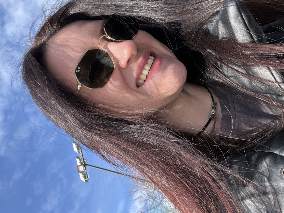 - "A young adult female is depicted in a close-up, outdoor shot under bright sunlight, with a clear blue sky and sparse white clouds in the background" by FM-D24c62, licensed under CC BY 4.0