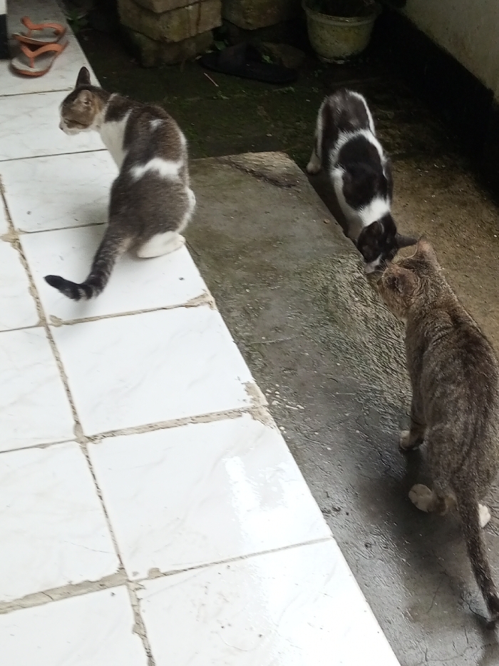 - "Three cats occupy an outdoor tiled and concrete space" by FM-xbDAm1, licensed under CC BY 4.0