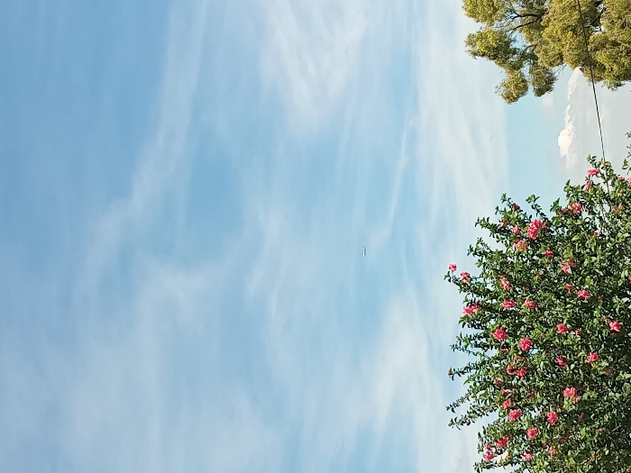 The image displays an outdoor scene in Germiston, South Africa, under a bright blue sky with dispersed white, wispy clouds. A solitary white aircraft is visible at high altitude in the upper-central portion of the frame, flying horizontally. The lower-left foreground features a dense, flowering shrub with numerous pink blossoms against dark green foliage. A portion of a second tree, characterized by lighter green, possibly yellowish-green, leaves, is present in the lower-right quadrant. A thin, dark line, consistent with an overhead utility wire, traverses horizontally through the lower-right section of the image. No people or overt actions are depicted.