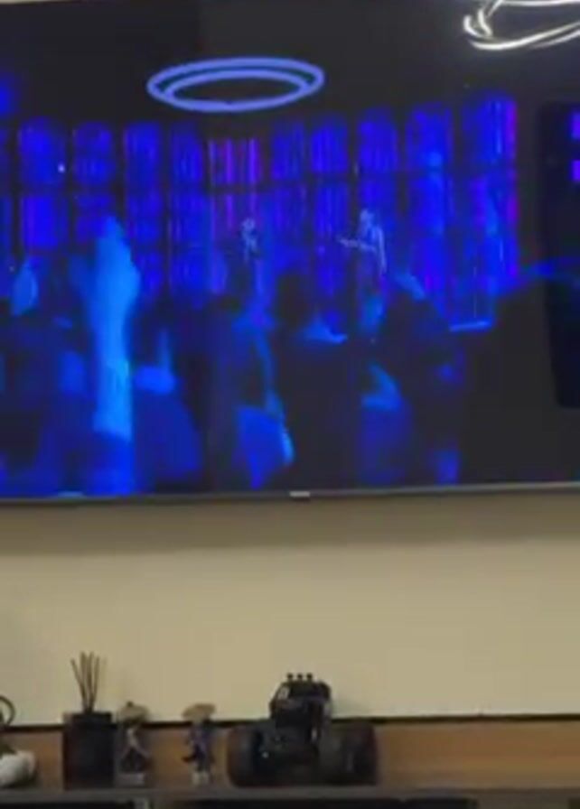 large television screen displaying a concert performance. The lighting on stage is predominantly blue and pink, creating a vibrant atmosphere. Two performers are visible: a man in a suit and tie and a woman in a long dress. The performers stand on a stage in front of a crowd, who have their hands up in the air. The camera zooms in to show the performers closer. Below the television is a shelf with a gaming controller, a figure, a toy truck, and some other decorative items. The background is a plain, light-colored wall.