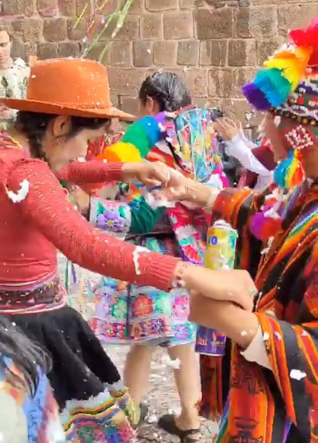 A group of people are celebrating in what appears to be a public space in Cusco, Peru. The participants are dressed in colorful traditional Andean clothing. One woman in a red shirt and black skirt with an orange hat is dancing with a man wearing a poncho. Both are covered in white foam. A young girl in the foreground has foam on her face. Other people are visible in the background, including a man taking pictures. Confetti is falling from above. The background is a stone wall.