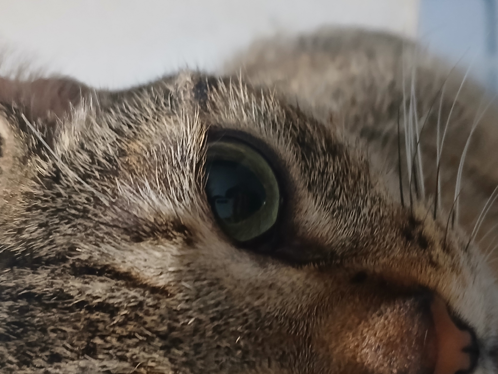 A close-up shot focuses on a cat's eye and the surrounding fur. The cat has tabby markings. The eye is green. The cat's nose and whiskers are visible. The environment is out of focus, with a light wall in the background. Location is unknown.