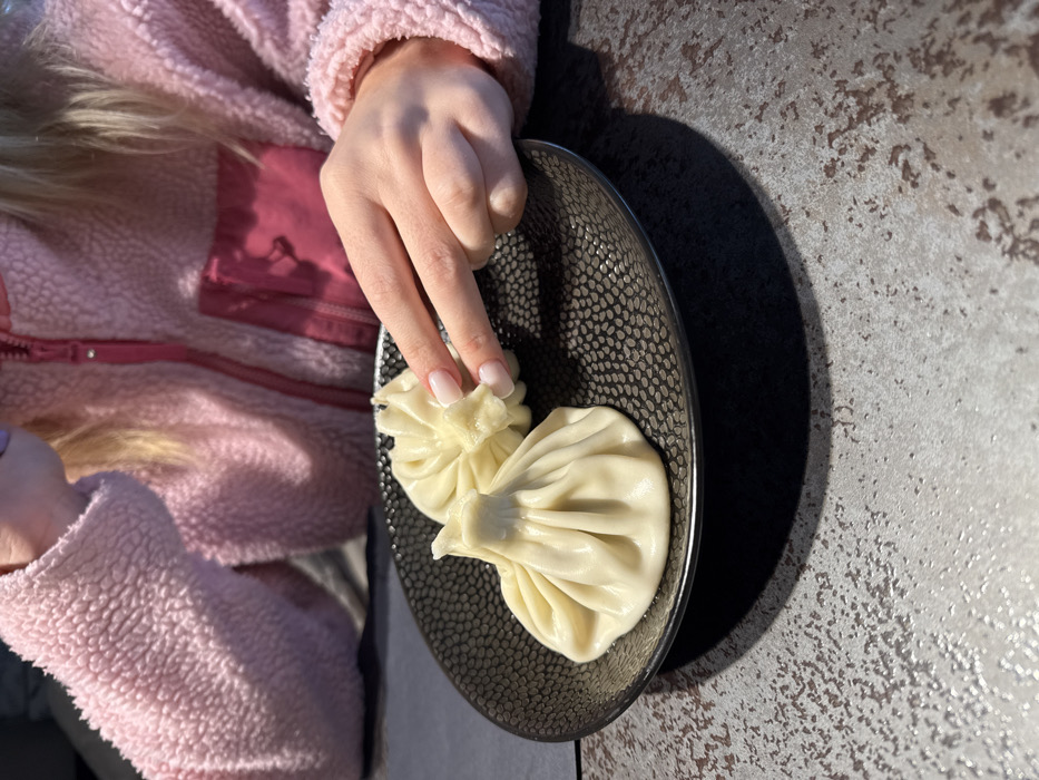 - "close-up view of two khinkali (Georgian dumplings) presented on a round, dark-colored plate with a dimpled texture" by FM-ruM6v2, licensed under CC BY 4.0