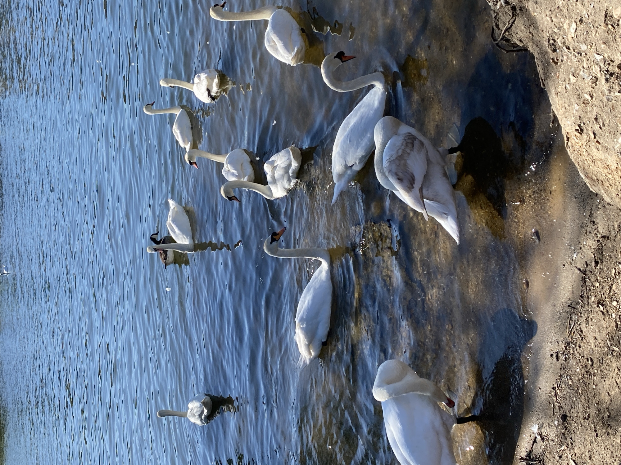 group of swans in the water near a shoreline in the Borough of Spelthorne, United Kingdom