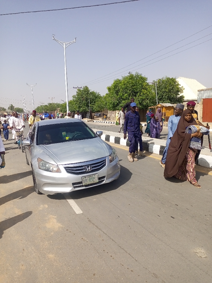 street scene in Maiduguri, Nigeria, located at coordinates 11.786 latitude and 13.139 longitude. A silver Honda Accord is parked on the right side of the road. The car is facing forward and its license plate is visible, reading "ABC-8325 J." The car is surrounded by people walking in various directions. There are a number of men and women in the image. Several men are dressed in traditional attire, including a white gown and a white cap, or a white gown and a brown head covering. Some of the men have facial hair. Several women are dressed in traditional Islamic attire. One woman is wearing a brown hijab. The woman in the center of the image has her face mostly obscured by the brown hijab. There is a man wearing a blue t-shirt and a blue cap, and another man wearing a dark blue uniform. There is an overhead street lamp in the background. The scene is bright and sunny. There is foliage on the sides of the road and buildings in the background. The street appears to be paved and has a white stripe down the middle of the lane. The sidewalk is paved with white rectangular tiles. The scene is taken at an angle, facing toward the center of the street, looking down the road, from slightly above the ground.