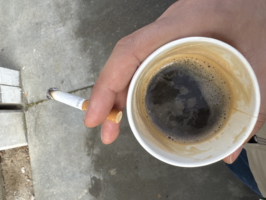 - "The image displays a close-up, high-angle view of a person's right hand holding a lit cigarette and a white paper cup containing black coffee" by FM-qthZ43, licensed under CC BY 4.0