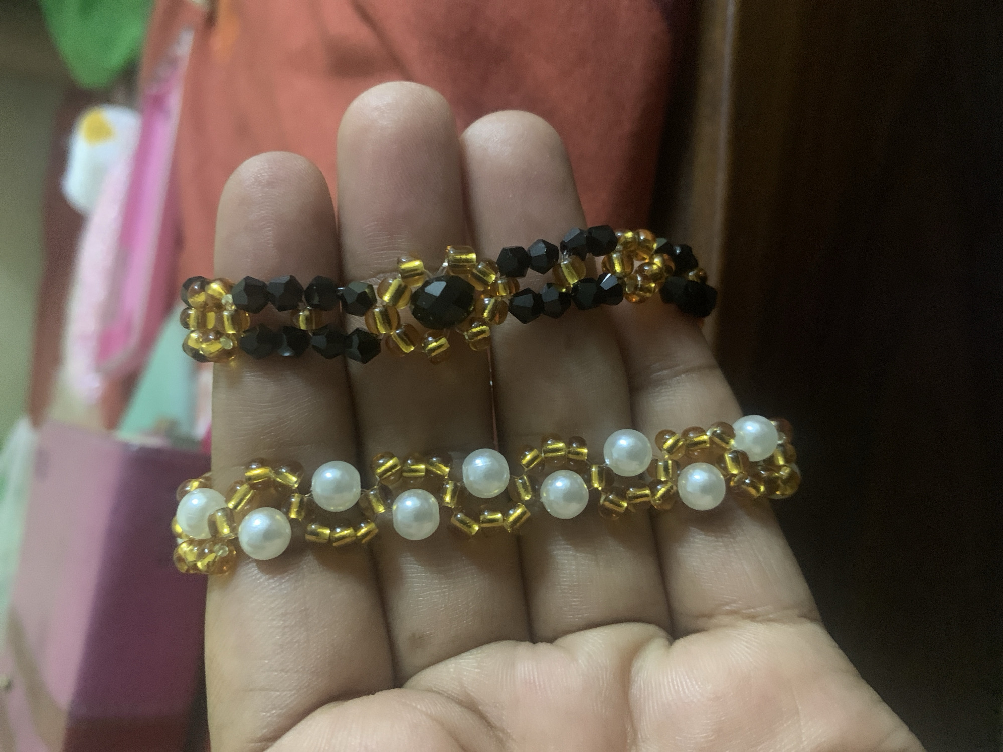 A hand displays two beaded rings. The top ring alternates gold and black beads, with a larger black bead at the center. The bottom ring features gold beads interspersed with white pearls. The background is blurred and indistinct, revealing only a pink box and a red surface. The location is unknown.