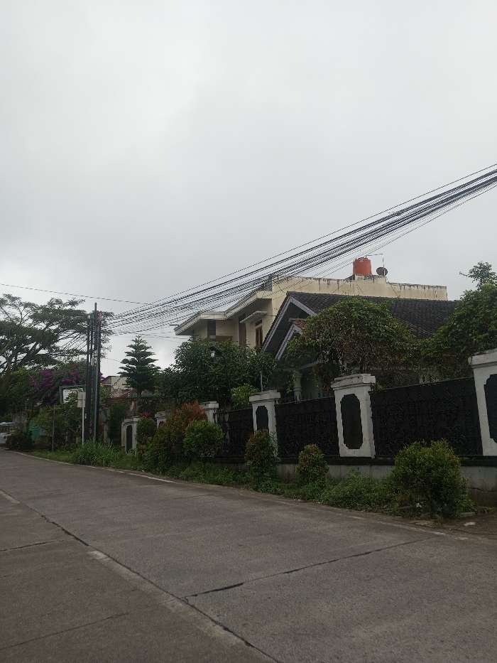The image presents a residential street view in Pacet, Indonesia, under an overcast sky. A paved, grey road with visible cracks and expansion joints occupies the lower half of the frame, receding towards the left. To the right of the road, a strip of unkempt ground vegetation precedes a dark, ornate fence with white or light-grey pillars featuring dark rectangular insets. Behind the fence, dense green foliage, including various trees and shrubs, partially conceals two multi-story houses. The house on the right exhibits a light-colored facade and a dark, gabled roof, with an orange cylindrical water tank and a small satellite dish visible on its flat roof section. On the left side of the road, a utility pole supports multiple black overhead utility lines that traverse the upper portion of the image. A white rectangular sign with purple text is partially visible on the left, near the utility pole, amidst trees. The scene is devoid of people or discernible activity.