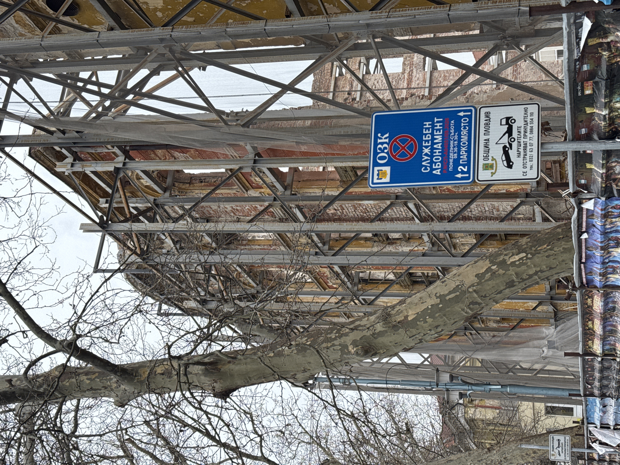 The image depicts an upward-angled view of a building undergoing construction or renovation, framed by bare tree branches. The building has exposed brickwork and a metal framework. Above the tree branch, street signs are visible. One is a blue sign indicating "ОЗК" and "СЛУЖЕБЕН АБОНАМЕНТ" (Service Subscription) for the hours 08:30-18:30, Monday to Saturday, with 2 parking spaces. The second sign is "Община Пловдив" (Municipality of Plovdiv) which warns that violators will be forcibly removed and provides a phone number. A stack of posters or flyers are on the right side. The location is in Plovdiv, Bulgaria.