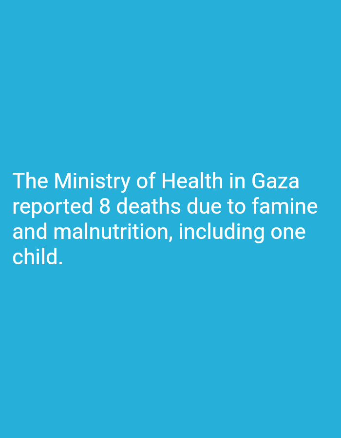 The image is a digital graphic featuring a solid, uniform blue background. White, sans-serif text is centrally aligned within the lower half of the frame. The text states: "The Ministry of Health in Gaza reported 8 deaths due to famine and malnutrition, including one child." The graphic does not visually depict any physical location, including the city of Dura, Palestinian Territory, nor does it show any people, objects, actions, or interactions within an environment. The content is purely textual information.