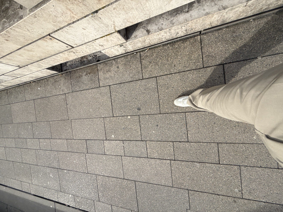 The image displays a first-person, downward perspective of an urban groundscape in Wuppertal, Germany, illuminated by strong sunlight. The ground consists of grey, speckled rectangular and square paving slabs arranged in a staggered pattern. Several small, light-colored specks are visible on the pavement. To the right, a multi-tiered, light-colored concrete or stone wall runs parallel to the paved path. A narrow, dark gutter or channel separates the pavement from the wall, containing dark debris and at least one visible cigarette butt. In the lower right quadrant, the lower portion of an individual's right leg is visible, clad in light beige trousers and a white athletic shoe with a light-colored sole. The leg is positioned forward, indicating either a paused stance or a stride in motion. Shadows cast by the leg and shoe extend onto the pavement to the right.