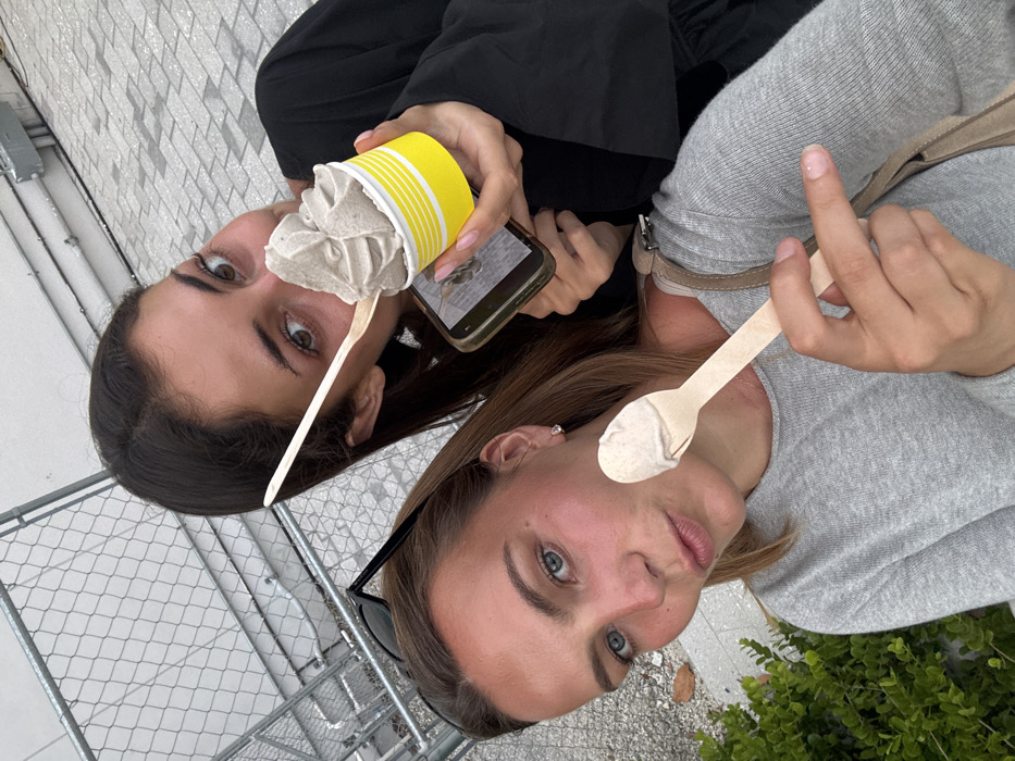 Two young adult females are depicted outdoors in Miami, United States, posing for a photograph while consuming frozen desserts