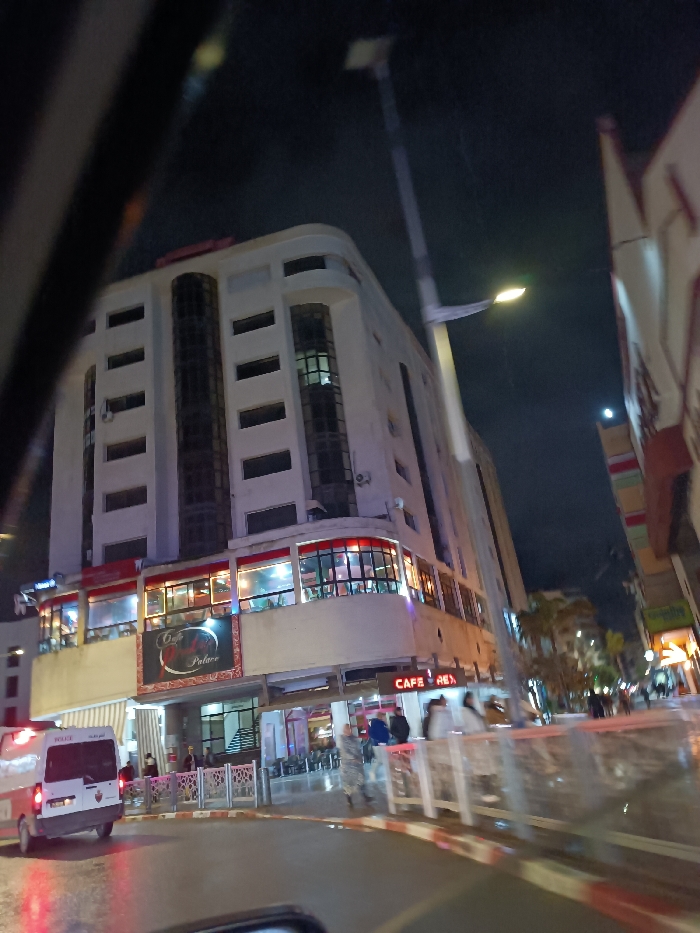 A nighttime street scene depicts a multi-story building with a restaurant or cafe on the lower floors. The cafe, named "Cafe Palace," is illuminated, and people are visible inside. A white van is parked on the street. A street light illuminates the surrounding area. Street-level fencing and people walking by are also visible. The image is taken from inside a vehicle, as part of the dashboard is visible.