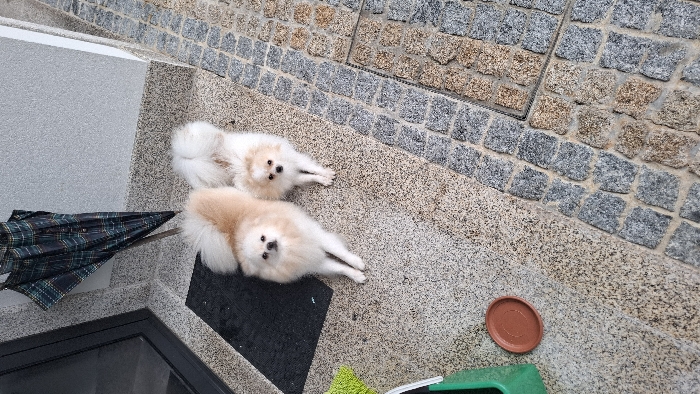 The image depicts an exterior scene at a building entrance in Barcelos, Portugal. Two Pomeranian dogs are centrally positioned, lying on a light-colored granite aggregate pavement. The larger dog, primarily light tan, lies in the left foreground, while a smaller, predominantly white Pomeranian is positioned to its right and slightly behind. Both dogs are looking directly towards the viewer. In the upper-left background, a folded, plaid (blue, green, brown) umbrella leans against a light gray, textured wall, adjacent to a dark-framed door and a black rectangular doormat. A green plastic object, possibly a broom handle, and a circular terracotta saucer are visible on the pavement in the lower-left. The granite aggregate pavement transitions to a patterned cobblestone pathway on the right, composed of alternating gray and tan granite blocks, with an integrated drainage grate visible within the cobblestone pattern.