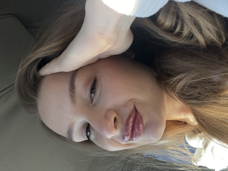 A close-up portrait displays a female subject positioned indoors, likely within a vehicle, in Donji Katun, Montenegro. The subject, exhibiting light-toned skin and long, wavy light brown hair, smiles gently with closed lips. Her lips are covered in a glossy, plum-toned product. Her eyes are partially closed, directed forward, with light eyeshadow and defined eyebrows visible. Her right hand is positioned on the upper right side of her head, with fingers resting against her temple and hairline. A portion of a white garment is visible on her lower left. Strong, direct lighting illuminates her face and hair from the left, creating pronounced highlights and shadows.